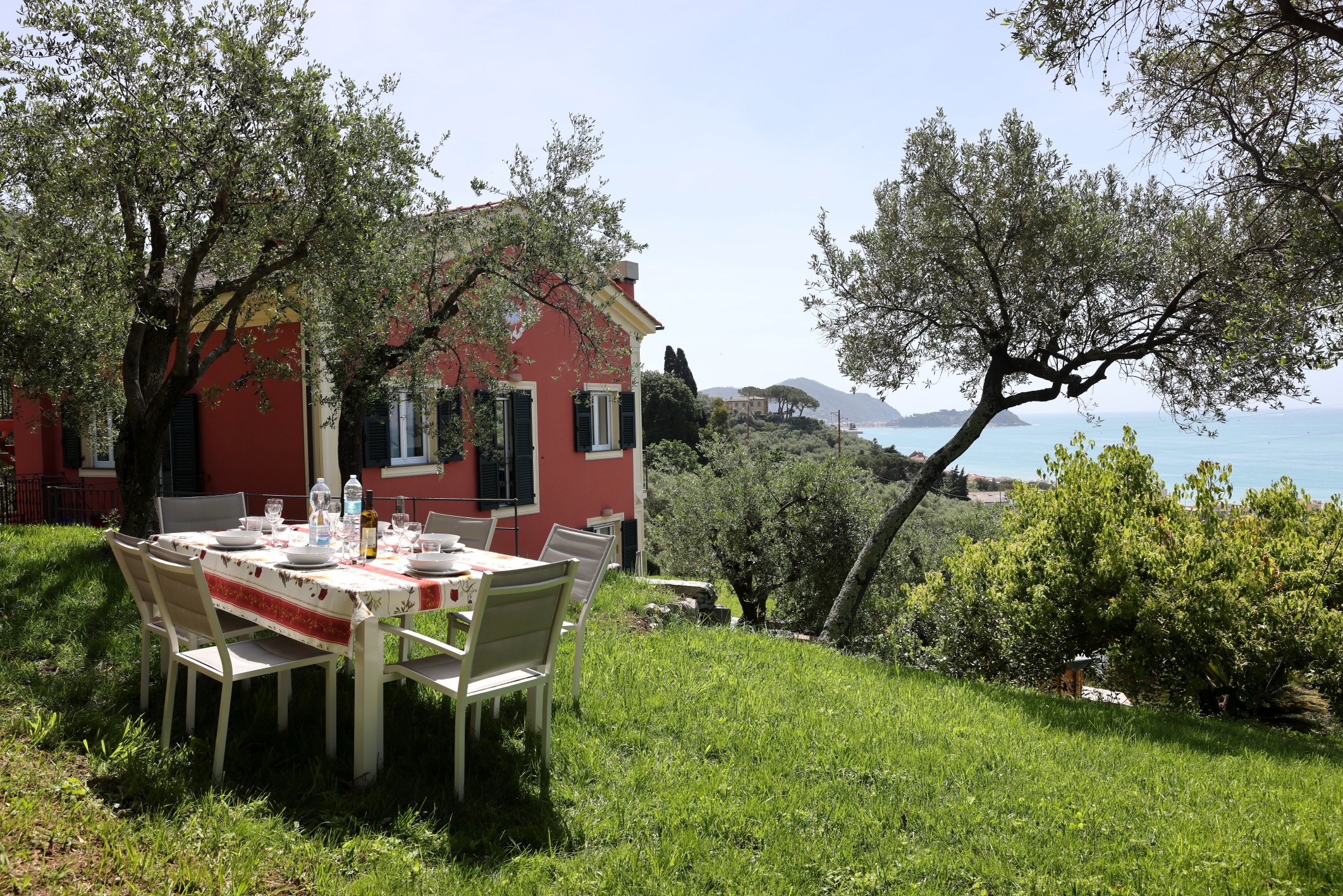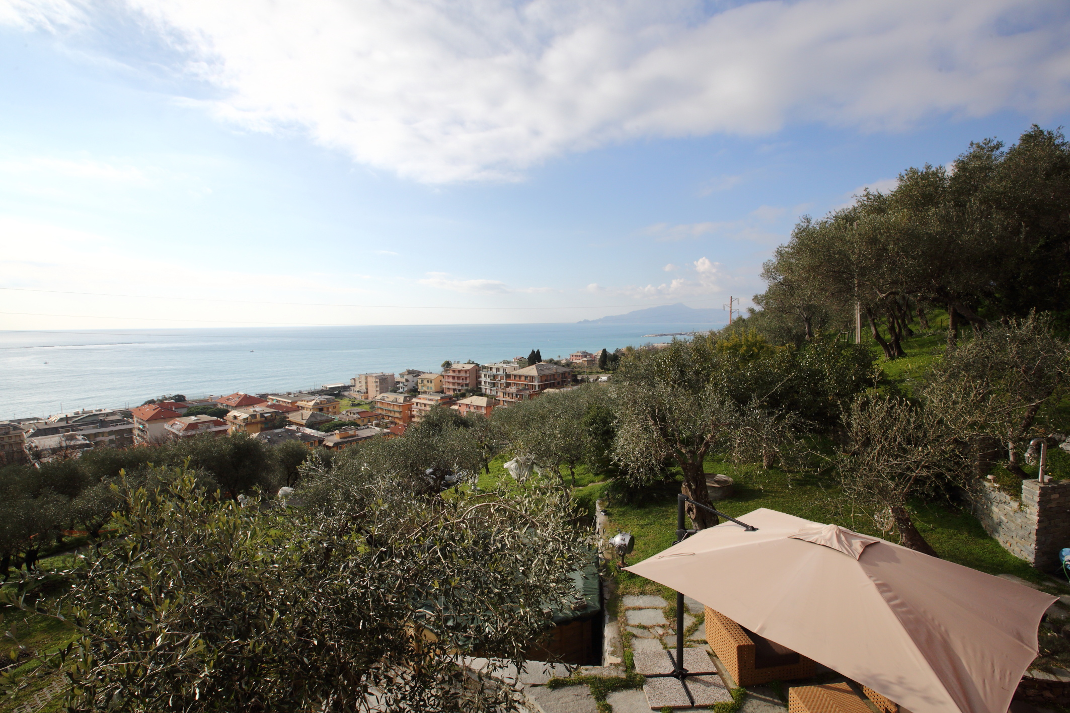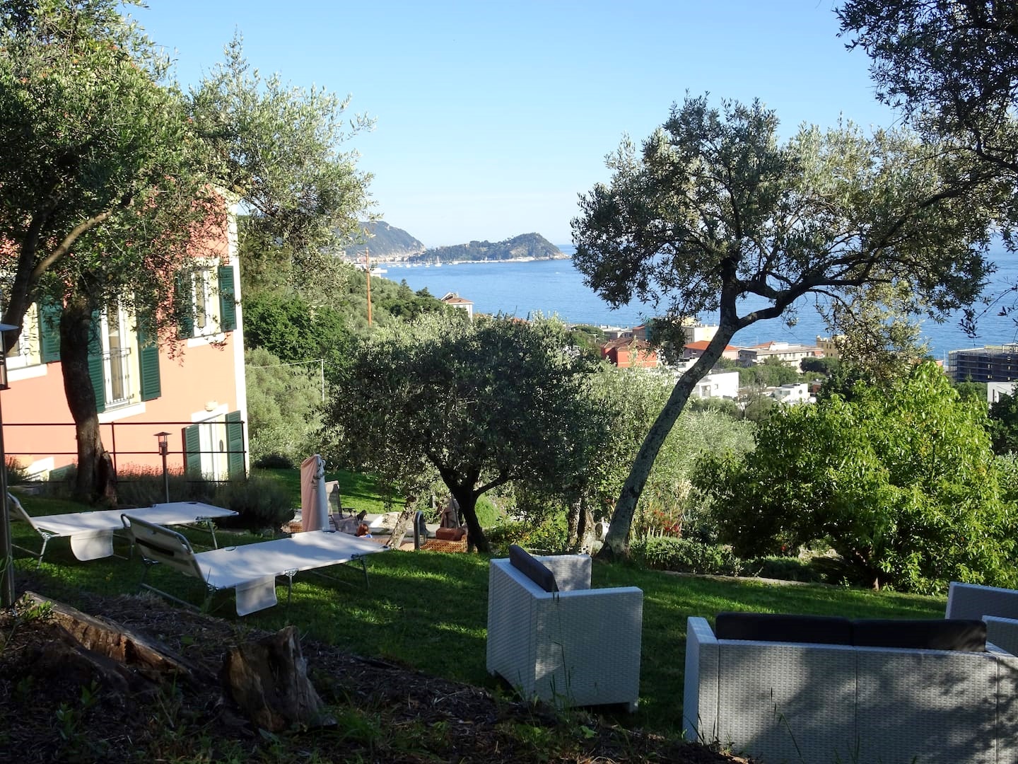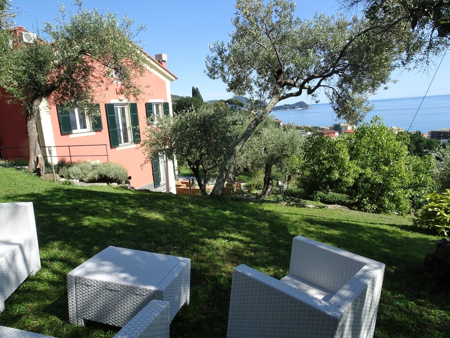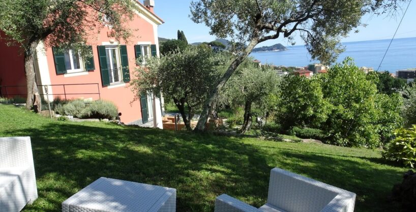 Vista mare da ogni ambiente della casa. Accesso diretto al bellissimo giardino di circa 1500 mq con zona pranzo e zona relax tra gli ulivi con bellissima vista mare.