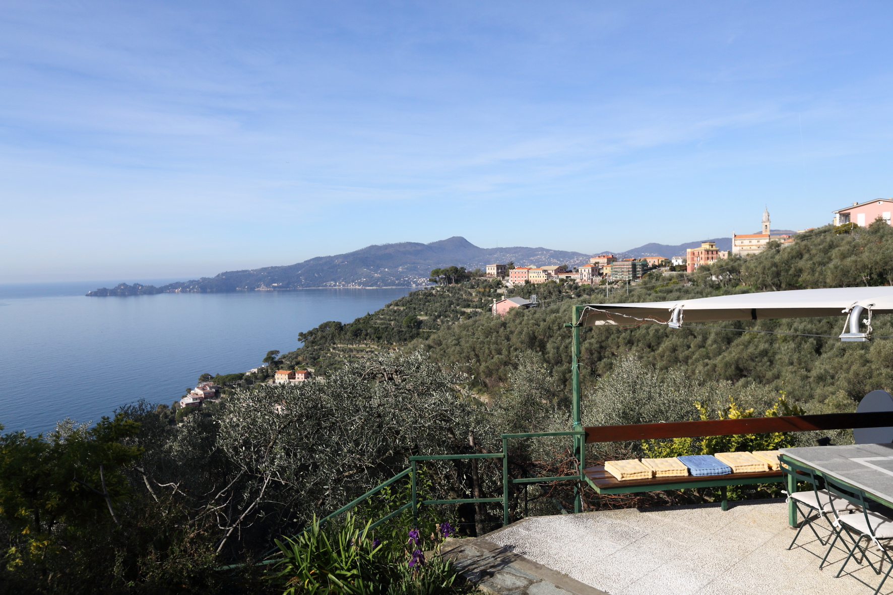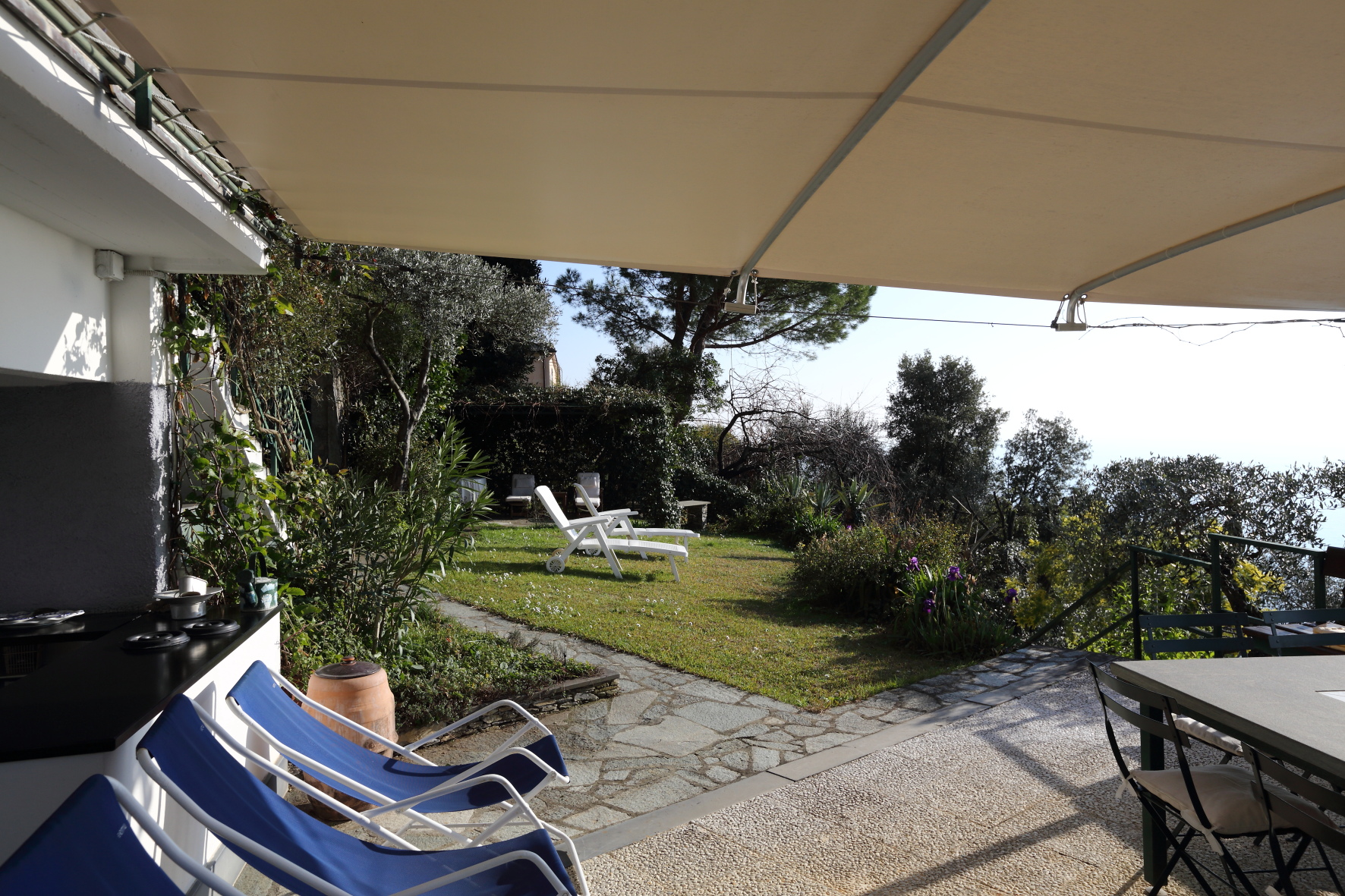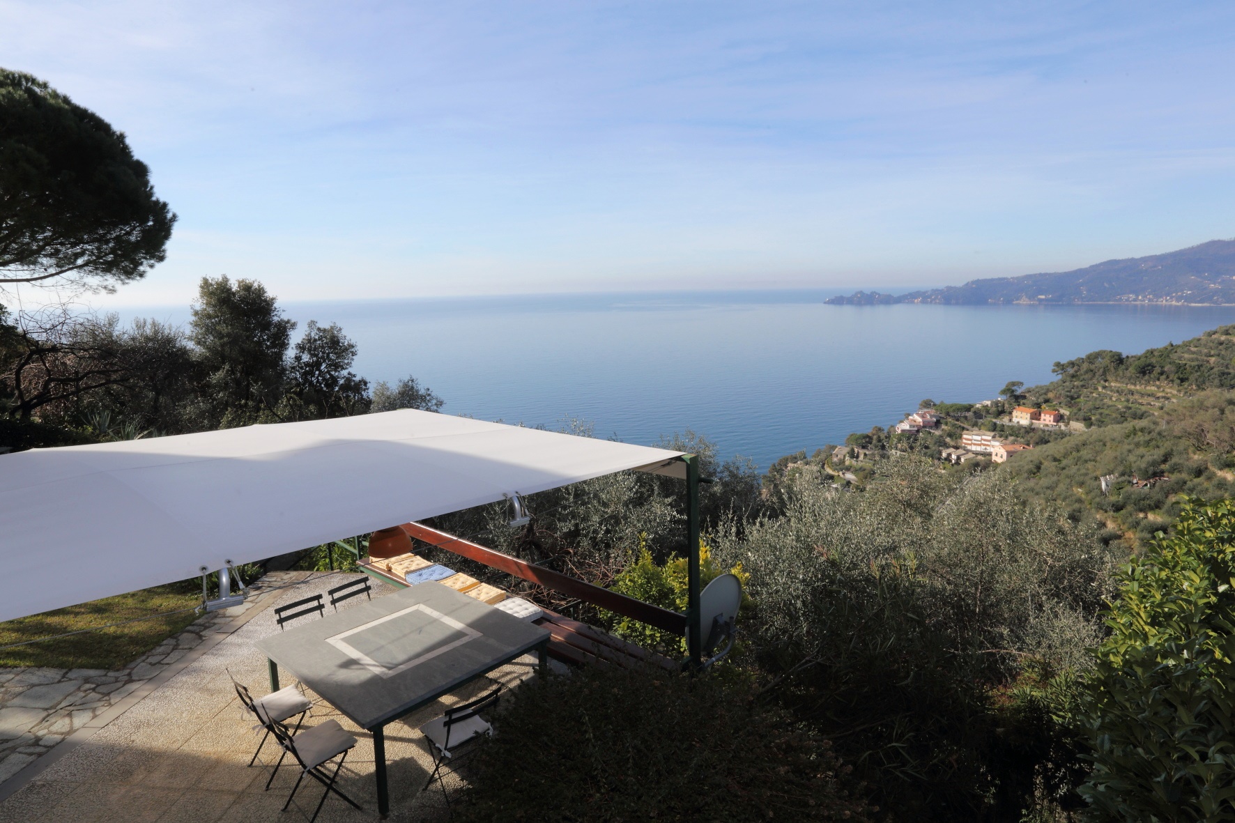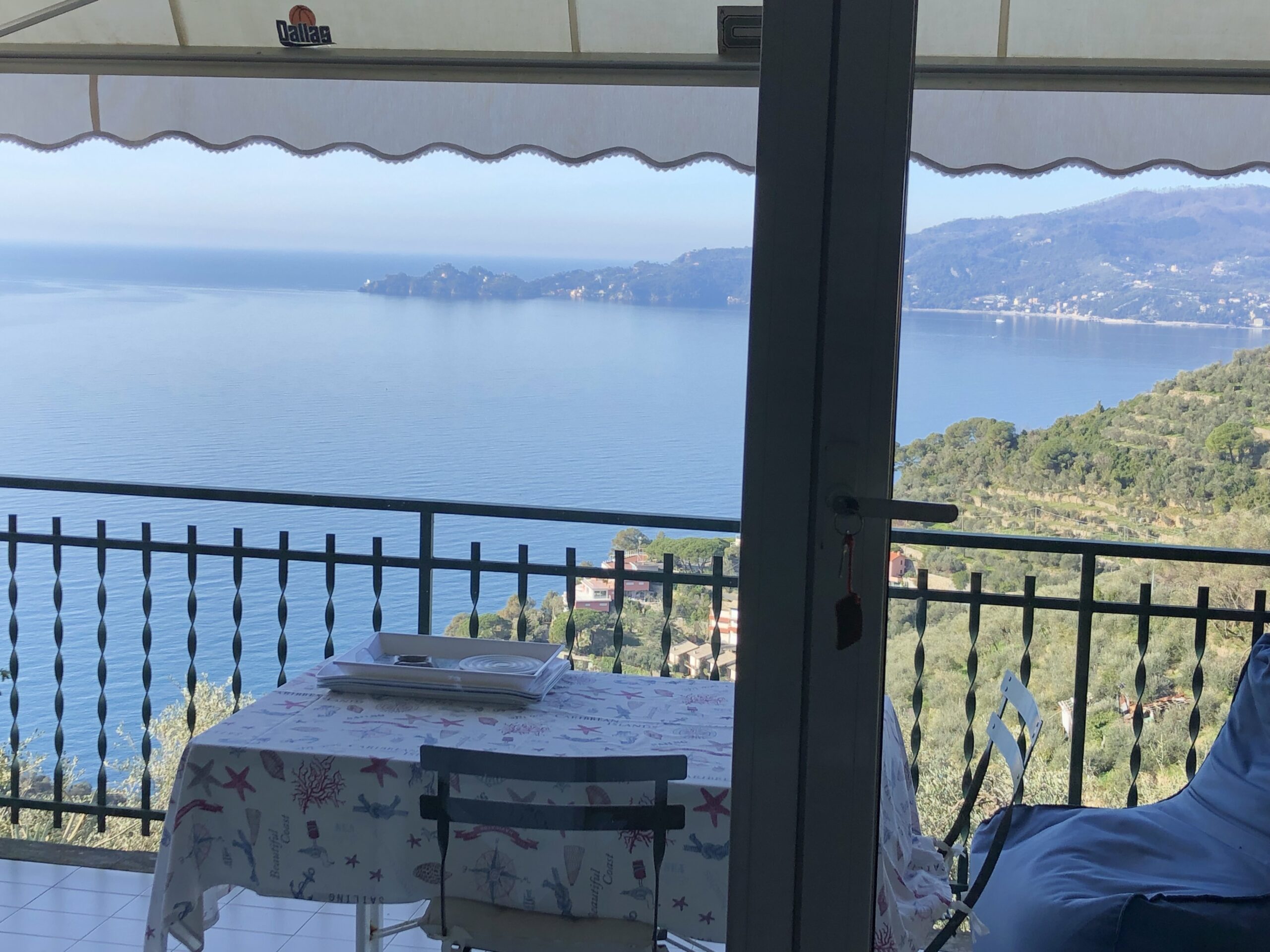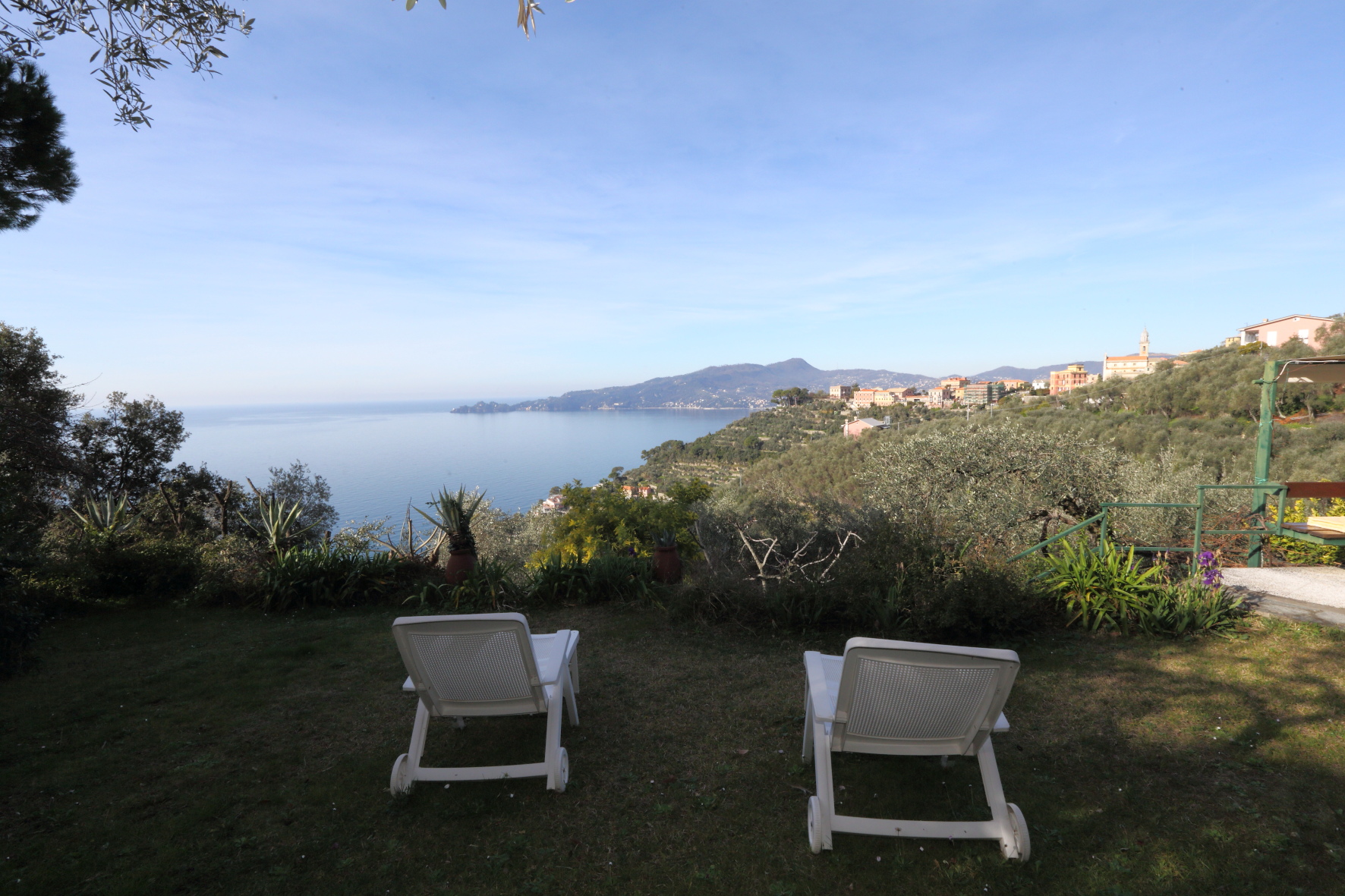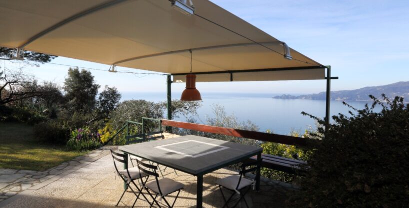 Appartamento disposto su due livelli per un totale di 230 mq interni più giardino di altri 300 mq con vista mare sul promontorio di Portofino. Due posti auto di proprietà a fianco a casa.